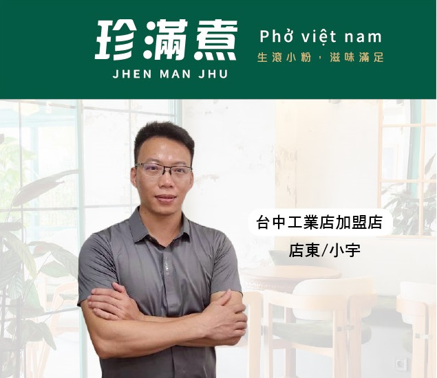宇玟長十多年前來台灣工廠打工,靠著勤奮與熱情學習餐飲技術。直到有天,他在網路上看到艾連盟加盟網珍滿煮品牌的介紹,並且吃過珍滿煮的河粉與越南當地的口味沒有差異很大甚至更勝一籌,被品牌理念深深吸引——珍滿煮主打「粥、鍋燒麵、河粉」三大產品線,簡單卻溫暖,平價卻用心。他說:「珍滿煮不只是賣吃的,更是在分享家的味道。」